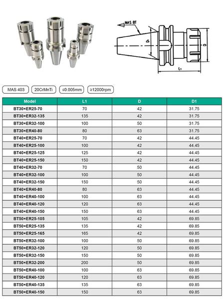 Патрон Цанговый с хв-ком 7:24 - BT40 (MAS403) (для станков c ЧПУ М16х2.0) под цанги ЕR32 (BT40-ER32-100)