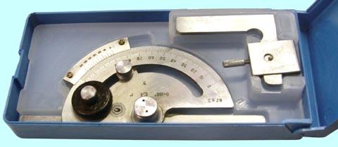 Угломер-транспортир с нониусом представляет собой пластину полукруглую со шкалой, разбитой на градусы, которая шарнирно соединяется «ласточкиным хвостом» латунными ползунками с направляющей. Приставляя угломер к детали, необходимо совместить базовую сторону детали с одним из краев направляющей линейки. Поворотом полукруглой пластины, перемещая ее по направляющей, ее совмещают с сопряженной линией детали. Угол определяется по шкале угольника.