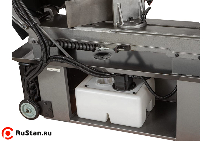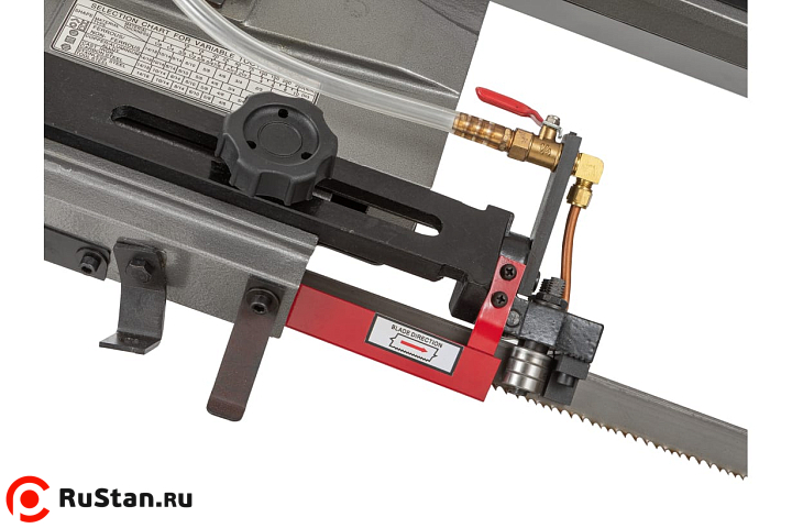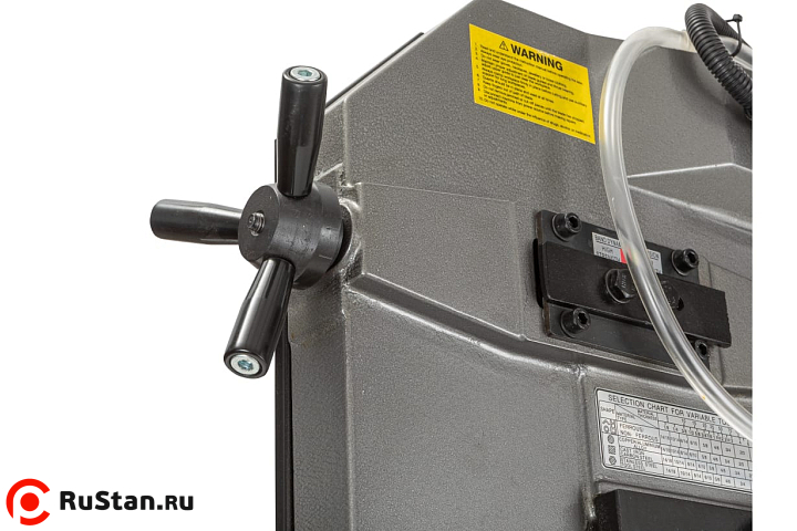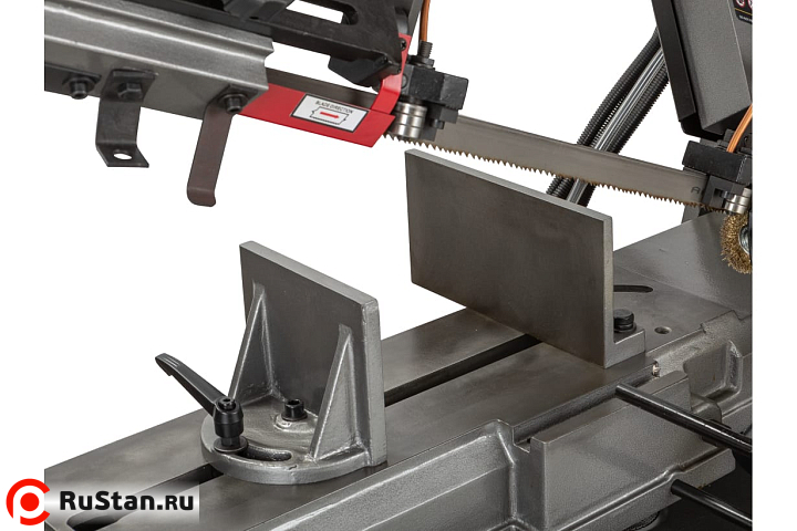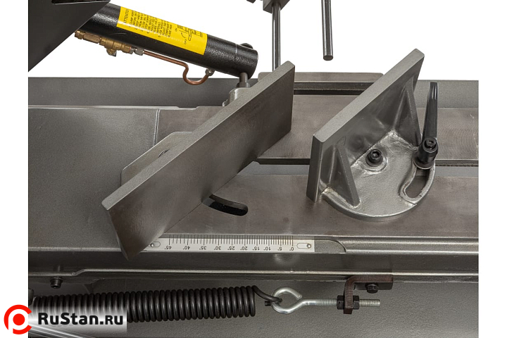Процесс установки заготовок под нужным углом осуществляется за счет имеющихся механических тисков, оборудованных поворотными губками. Подъем и опускание тяжелой пильной рамы осуществляется за счет функционирования системы гидроразгрузки. С помощью гидроцилиндра можно осуществить регулировку скорости опускания консоли. Необходимое прижимное усилие рамы на обрабатываемую заготовку осуществляется за счет веса консоли.