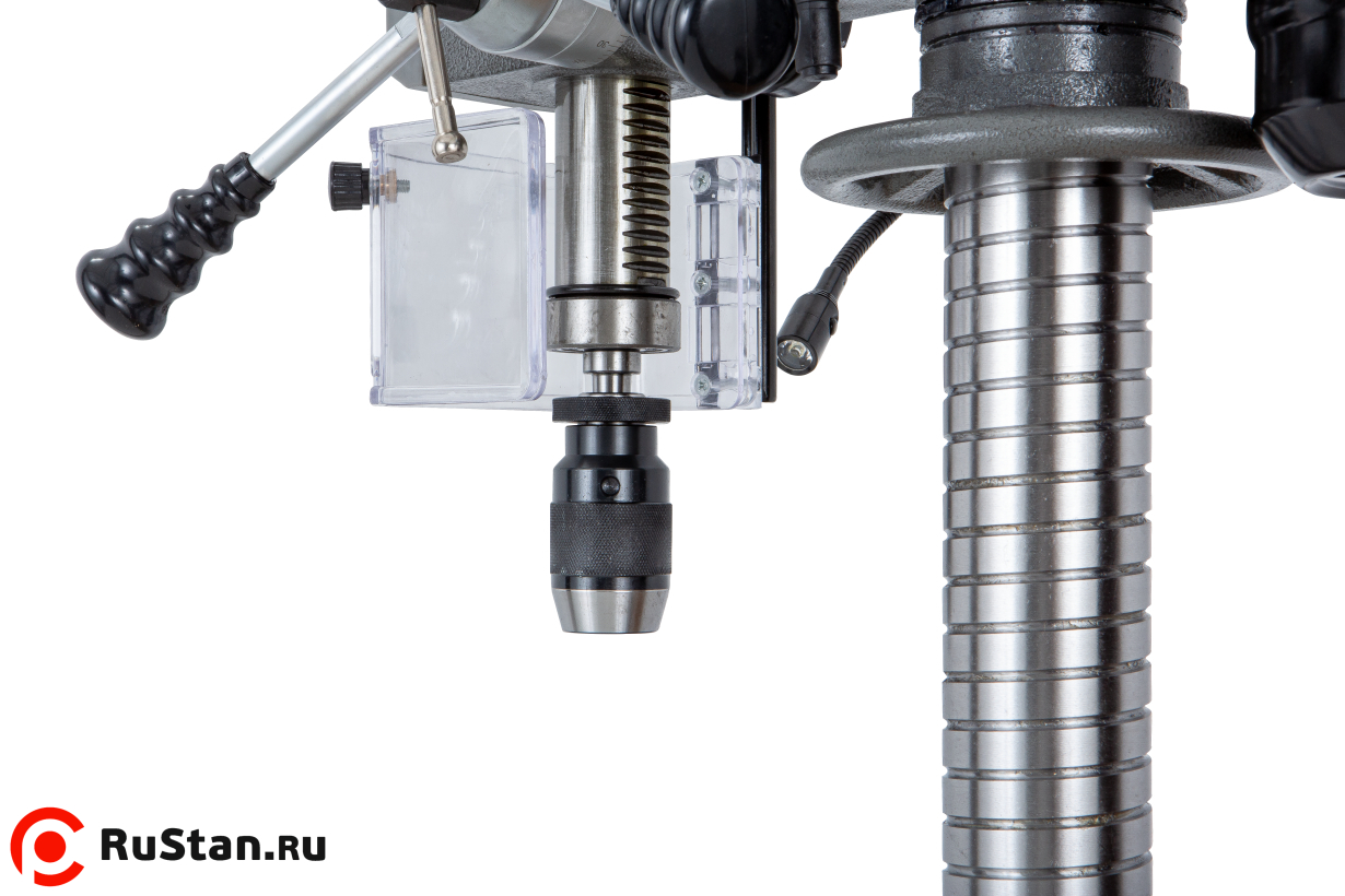 Ход пиноли шпинделя составляет 85 мм. Для контроля глубины сверления предусмотрена шкала на лимбе с миллиметровой разметкой, а также стопорный зажимной винт для ограничения хода пиноли.