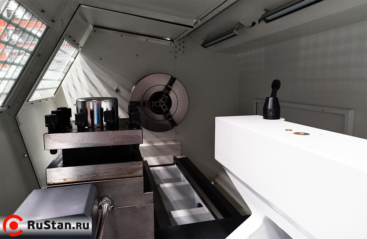 - Станок оснащен 4-х позиционной резцедержкой с вертикальной осью вращения и бесконтактным датчиком позиции, позволяющей реализовать обработку большего диаметра заготовки, по сравнению с установкой 8 позиционной.