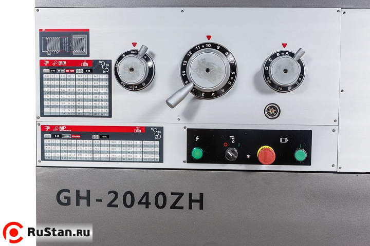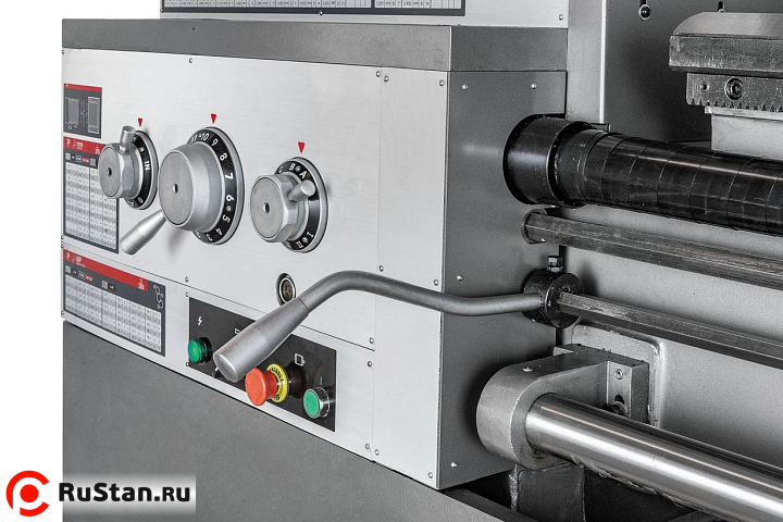 Пониженная скорость 9 об/мин выставляется при необходимости нарезания резьбы плашкой. На станке предустановлены 80 режимов продольных и поперечных подач, что позволяет нарезать метрическую, дюймовую, модульную и питчевую резьбы с повышенным уровнем точности. При этом биение на шпинделе не превышает 9 микрон. Привод шпинделя постоянно находятся в масляной ванне, что способствует охлаждению, снижает уровень шума и продлевает срок эксплуатации станка. Для уменьшения вибраций и качественного теплоотвода от инструмента и шпинделя станок установлен на массивную станину из особопрочного чугуна.